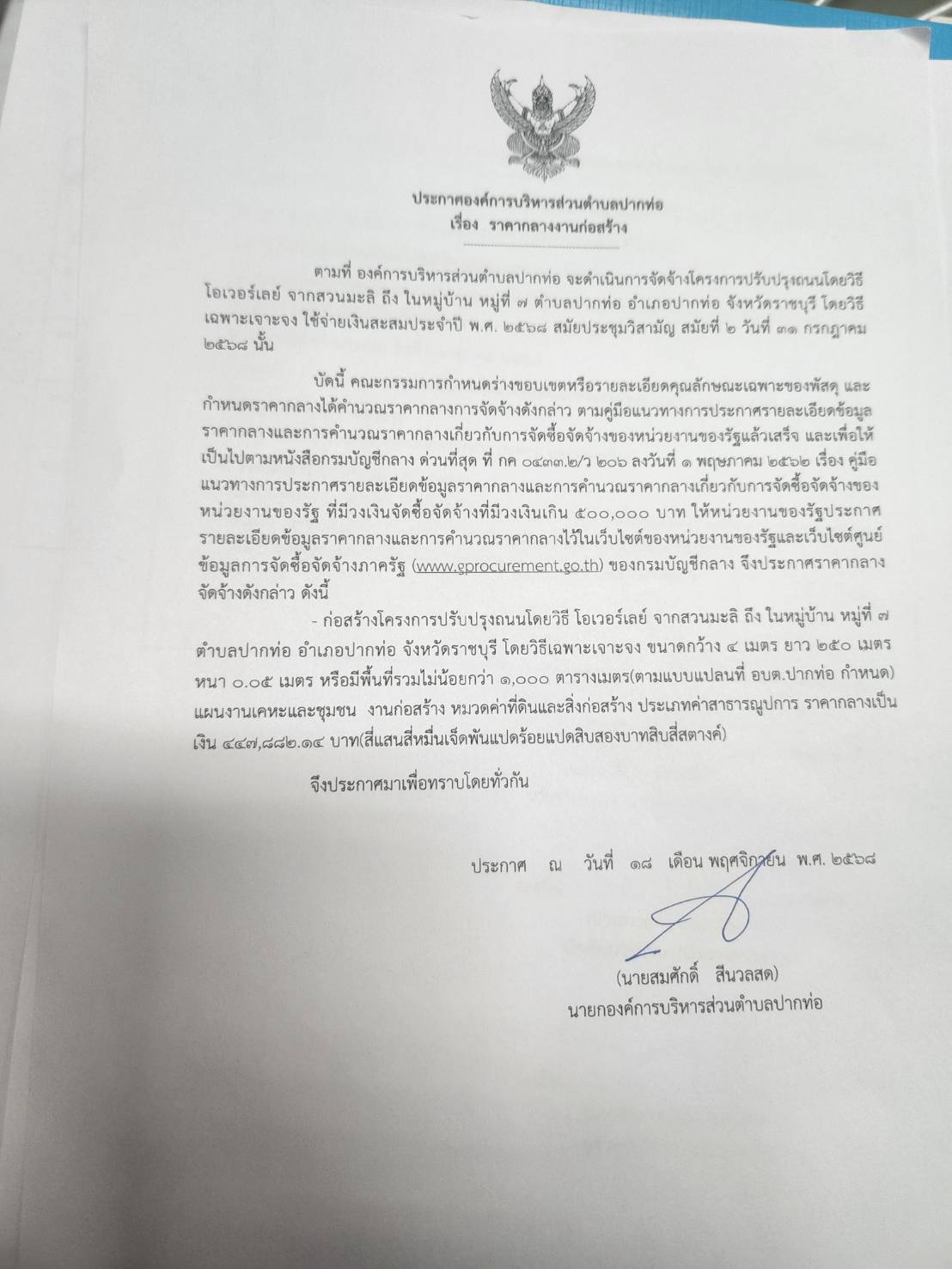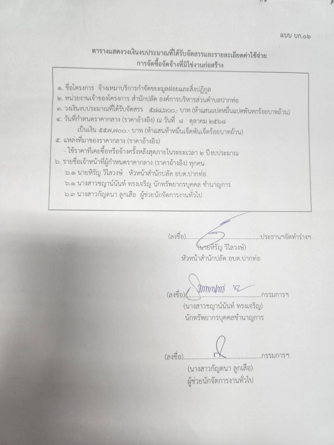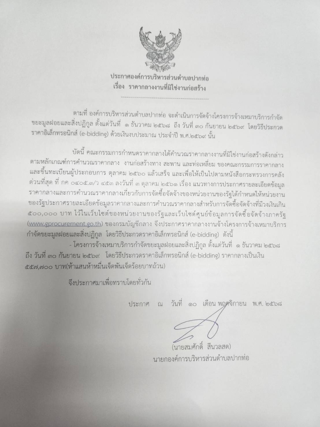 ประกวดราคาจ้างโครงการจ้างเหมาบริการกำจัดขยะมูลฝอยและสิ่งปฏิกูล ตั้งแต่วันที่ 1 ธันวาคม 2568 ถึง วันที่ 30 กันยายน 2569 ด้วยวิธีประกวดราคาอิเล็กทรอนิกส์ (e-bidding)