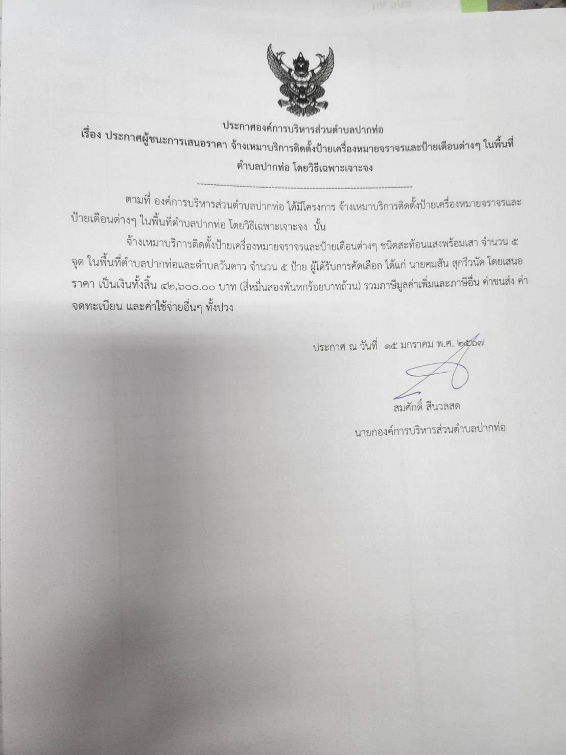 ประกาศผู้ชนะการเสนอราคา จ้างเหมาบริการติดตั้งป้ายเครื่องหมายจราจรและป้ายเตือนต่างๆ ในพื้นที่ตำบลปากท่อ โดยวิธีเฉพาะเจาะจง